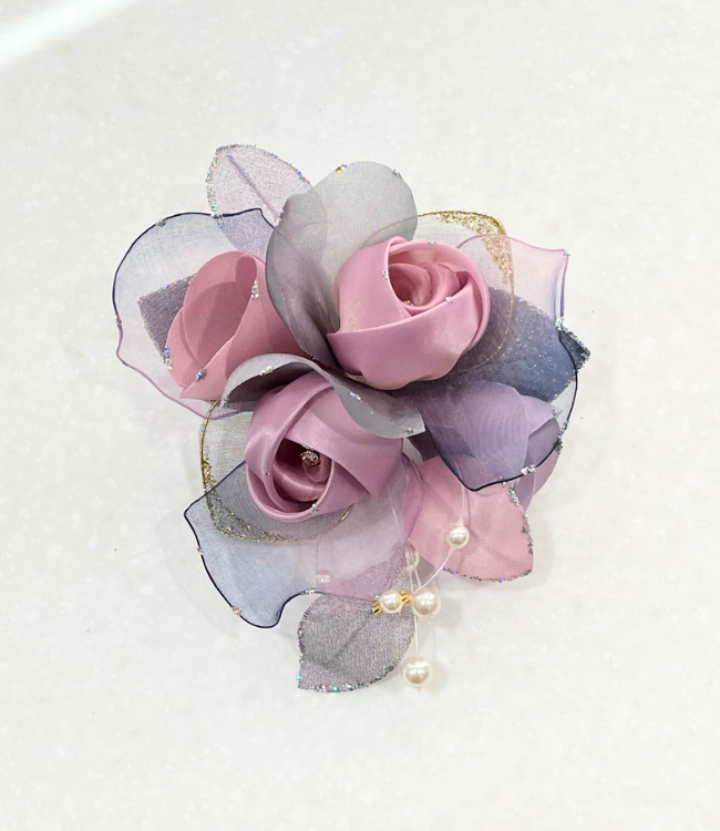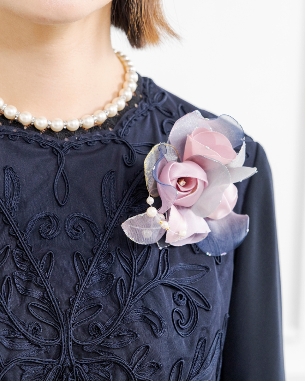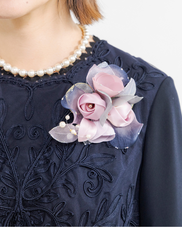 ドレスやボレロジャケットなどのワンポイントに人気のバラモチーフのコンパクトコサージュ。