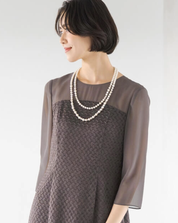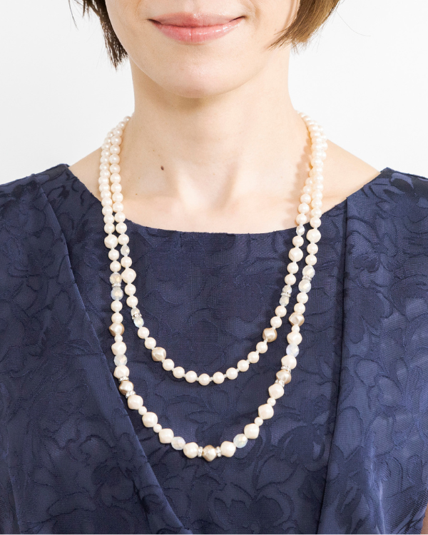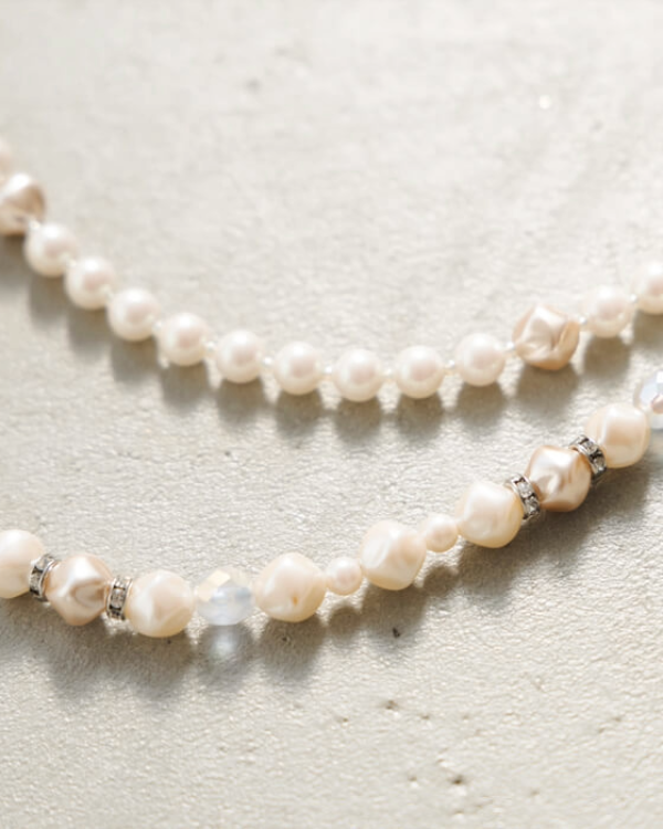 パールやロンデル、クリスタルビーズを組み合わせたロングネックレス。2連にすることで華やかさがありつつも、淡いカラーリングで落ち着いた印象に。