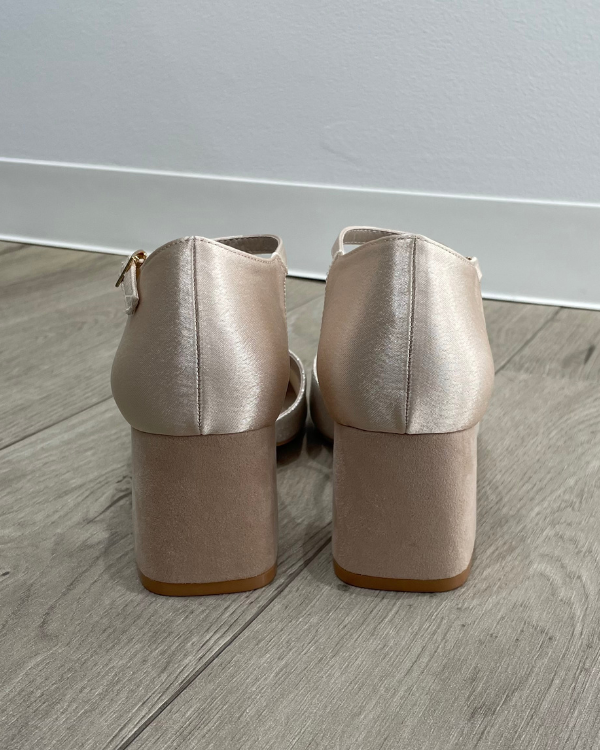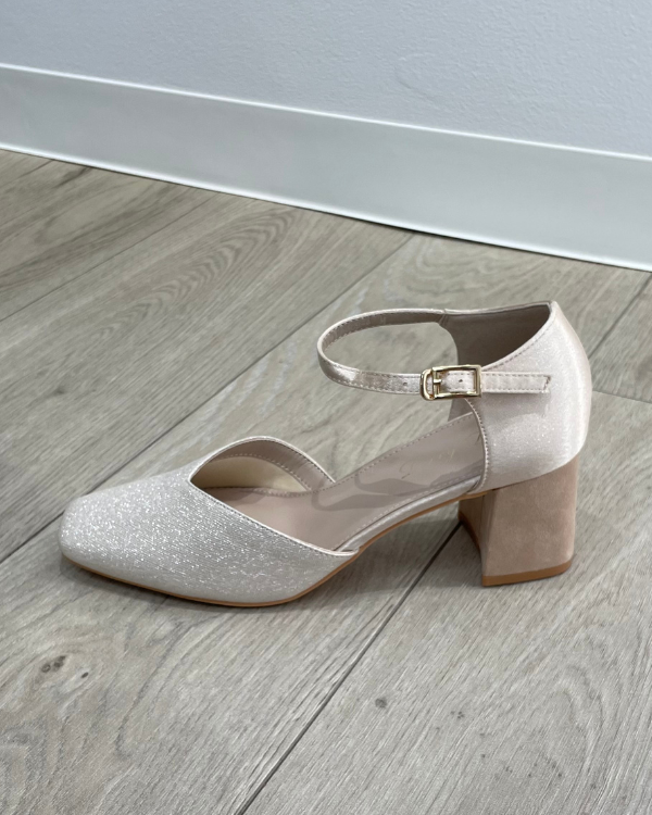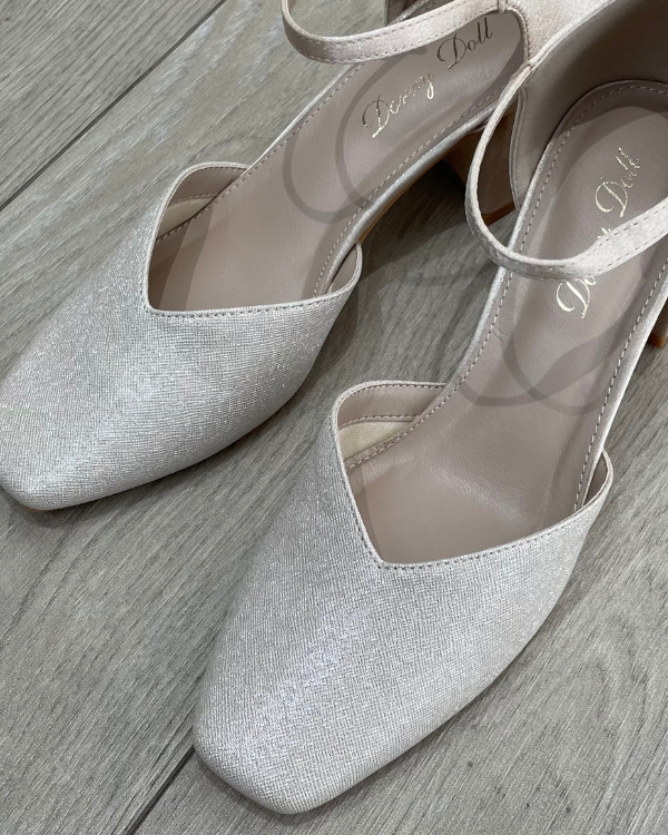 メインとなるフロント部分には結婚式などのお祝いのシーンに相応しいラメ素材、かかと部分は艶やかなサテン生地、そしてヒール部分はスエード生地を使用して華やかな仕上がりに。上品かつフェミニンな印象のスクエアトゥデザインも当店では初登場です!