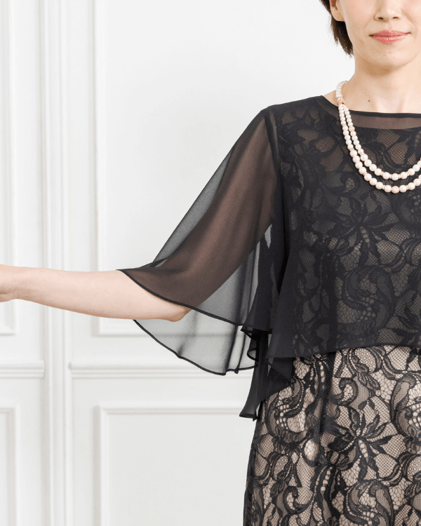程良い透け感があるシフォン素材のケープは、軽やかでソフトな肌ざわりです。完全に取り外しができるため、着脱も簡単です。