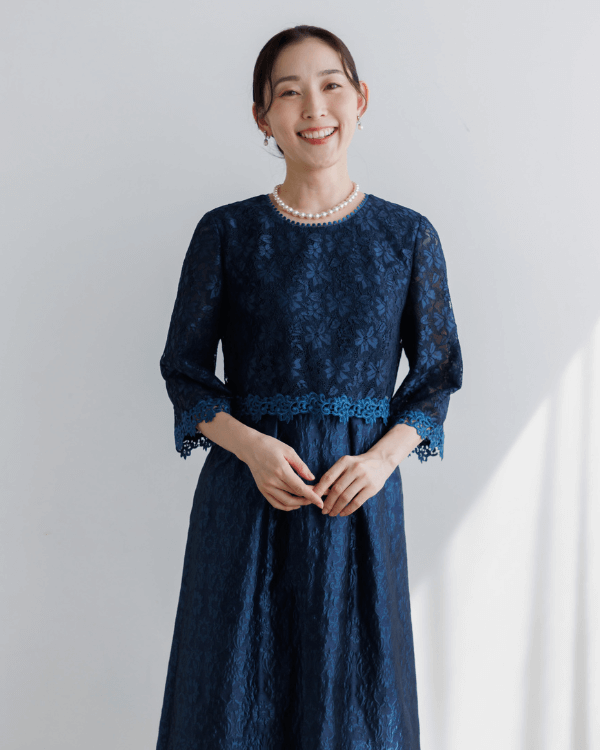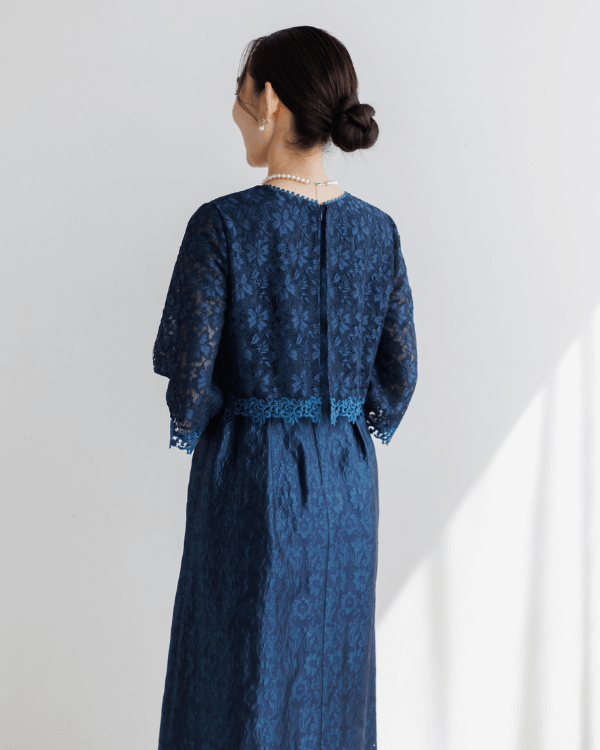 程よい透け感のあるフラワーレースのお袖は、シンプルなフレアーラインと七分袖で動きやすい仕上がりに。ブラウスを重ねた様にワンピースと一体になっており、ジャケットを羽織らずともお召し頂けます。