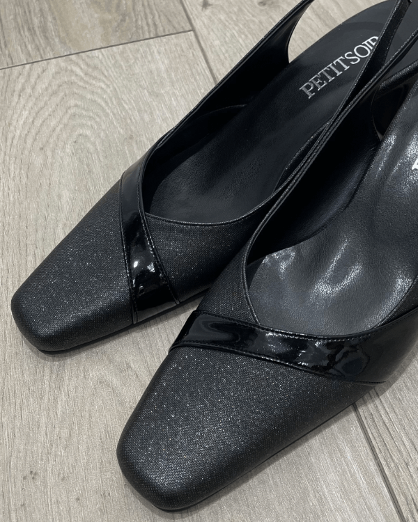 ラメ入りの生地はそのままに、今回はエナメルのラインでアクセントを施しました。滑らかな曲線が女性らしさを演出。ご好評頂いているスクエアトゥのデザインも継続です!